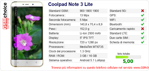 Dati del telefono cellulare Coolpad Note 3 Lite sul tuo sito