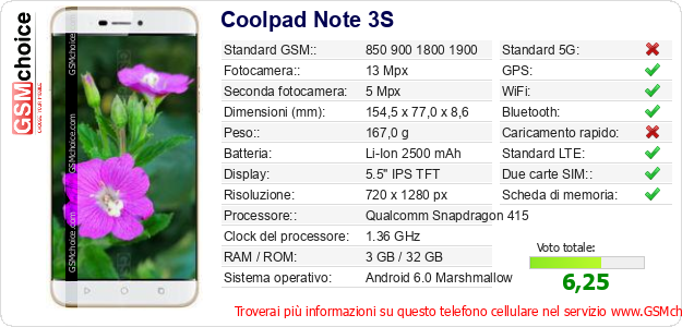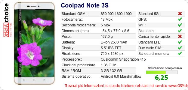 Dati del telefono cellulare Coolpad Note 3S sul tuo sito