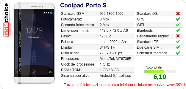 Dati del telefono cellulare Coolpad Porto S sul tuo sito