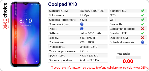 Dati del telefono cellulare Coolpad X10 sul tuo sito