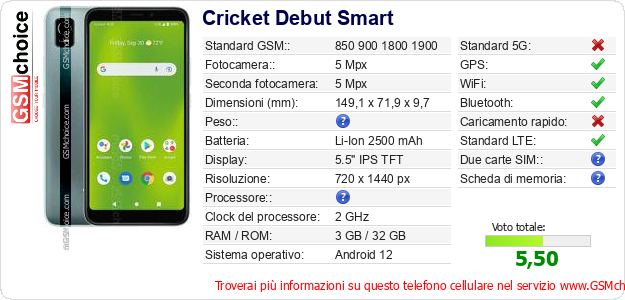 Dati del telefono cellulare Cricket Debut Smart sul tuo sito