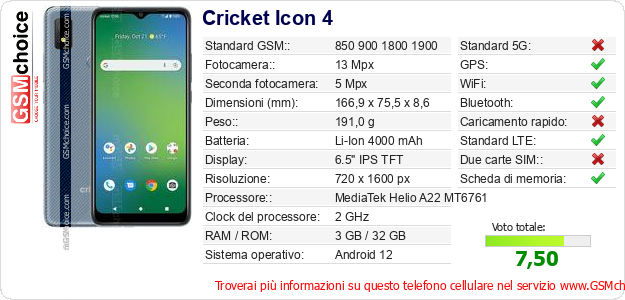 Dati del telefono cellulare Cricket Icon 4 sul tuo sito