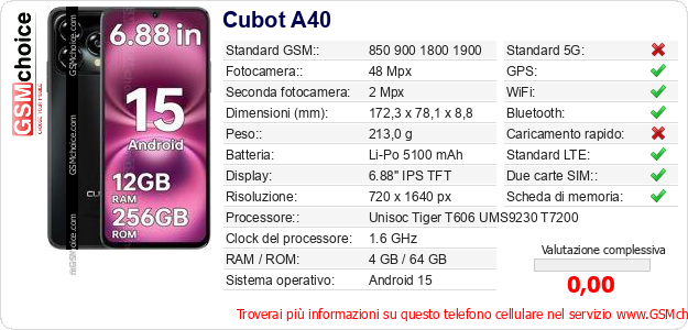 Dati del telefono cellulare Cubot A40 sul tuo sito