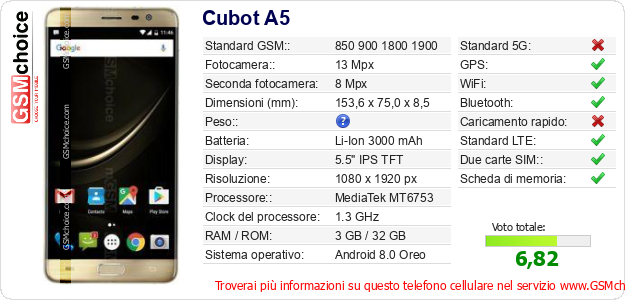 Dati del telefono cellulare Cubot A5 sul tuo sito