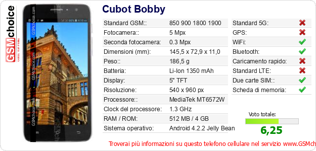 Dati del telefono cellulare Cubot Bobby sul tuo sito