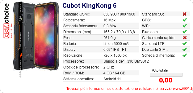 Dati del telefono cellulare Cubot KingKong 6 sul tuo sito