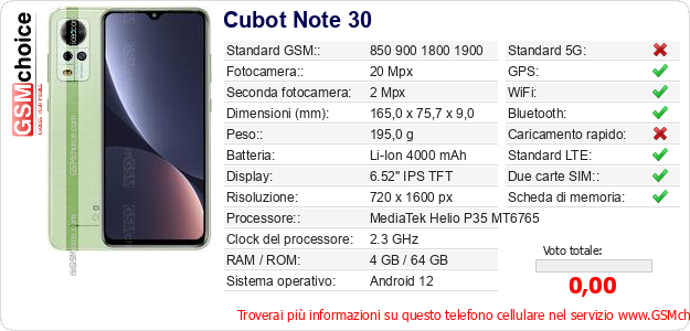 Dati del telefono cellulare Cubot Note 30 sul tuo sito
