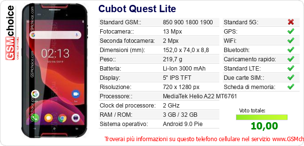 Dati del telefono cellulare Cubot Quest Lite sul tuo sito