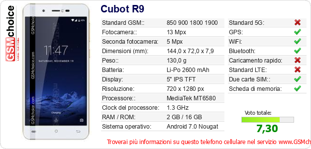 Dati del telefono cellulare Cubot R9 sul tuo sito