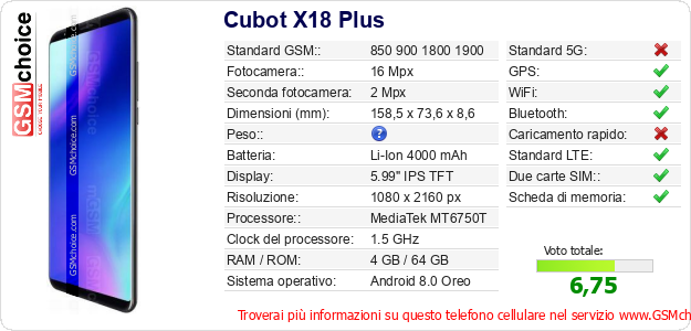 Dati del telefono cellulare Cubot X18 Plus sul tuo sito