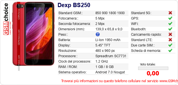 Dati del telefono cellulare Dexp BS250 sul tuo sito