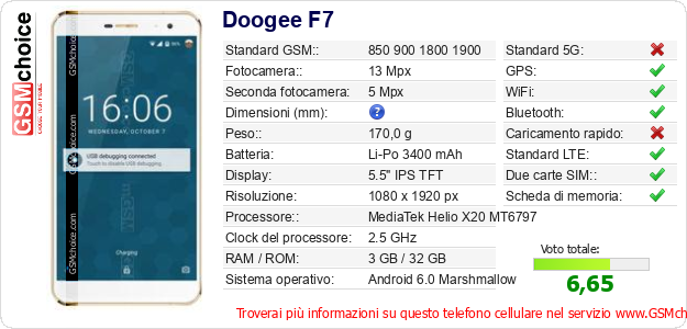 Dati del telefono cellulare Doogee F7 sul tuo sito