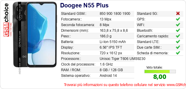 Dati del telefono cellulare Doogee N55 Plus sul tuo sito