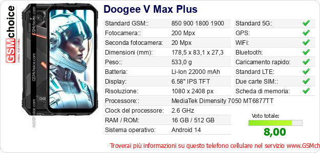 Dati del telefono cellulare Doogee V Max Plus sul tuo sito