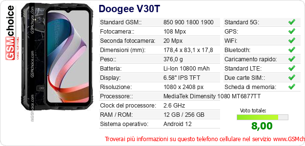 Dati del telefono cellulare Doogee V30T sul tuo sito