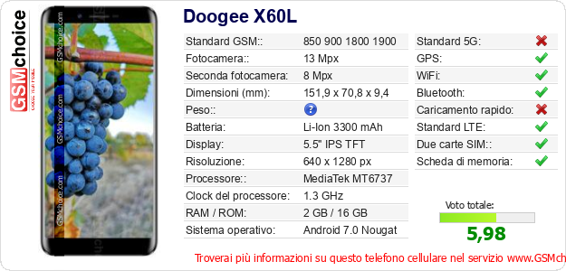 Dati del telefono cellulare Doogee X60L sul tuo sito