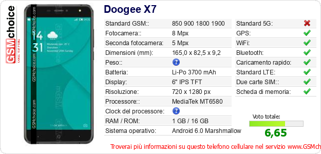 Dati del telefono cellulare Doogee X7 sul tuo sito
