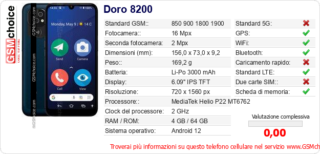 Dati del telefono cellulare Doro 8200 sul tuo sito