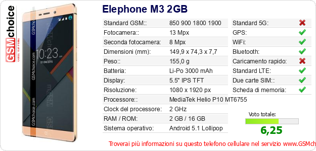 Dati del telefono cellulare Elephone M3 2GB sul tuo sito