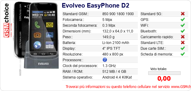 Dati del telefono cellulare Evolveo EasyPhone D2 sul tuo sito