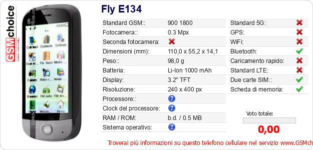 Dati del telefono cellulare Fly E134 sul tuo sito