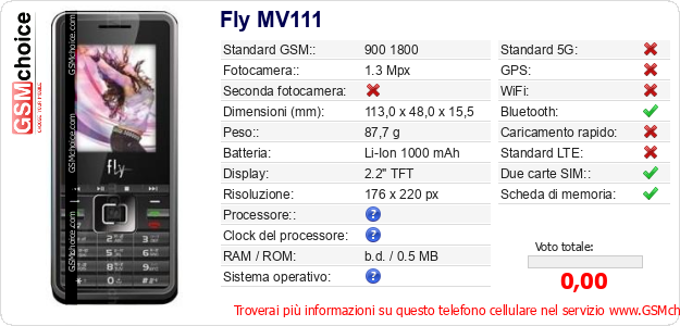 Dati del telefono cellulare Fly MV111 sul tuo sito