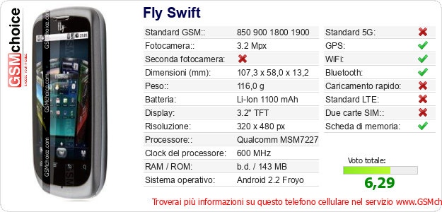 Dati del telefono cellulare Fly Swift sul tuo sito