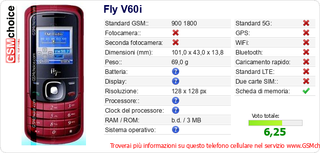 Dati del telefono cellulare Fly V60i sul tuo sito