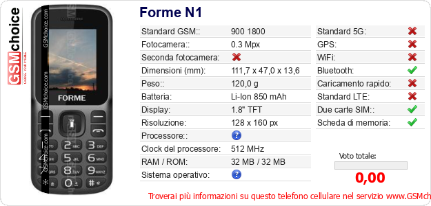 Dati del telefono cellulare Forme N1 sul tuo sito