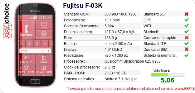 Dati del telefono cellulare Fujitsu F-03K sul tuo sito