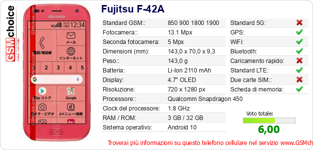 Dati del telefono cellulare Fujitsu F-42A sul tuo sito