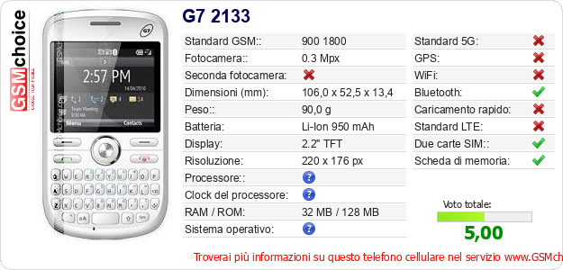 Dati del telefono cellulare G7 2133 sul tuo sito