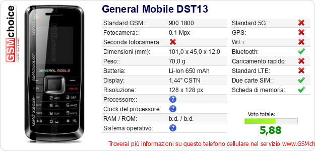 Dati del telefono cellulare General Mobile DST13 sul tuo sito