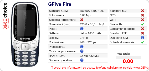 Dati del telefono cellulare GFive Fire sul tuo sito