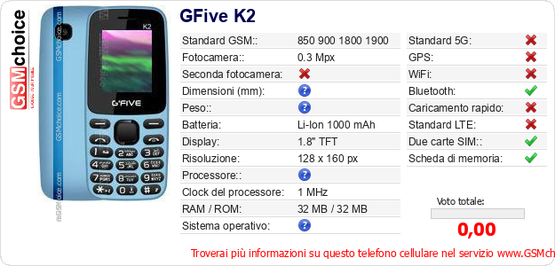 Dati del telefono cellulare GFive K2 sul tuo sito