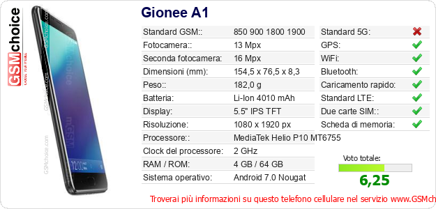 Dati del telefono cellulare Gionee A1 sul tuo sito