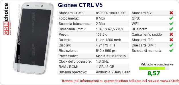 Dati del telefono cellulare Gionee CTRL V5 sul tuo sito