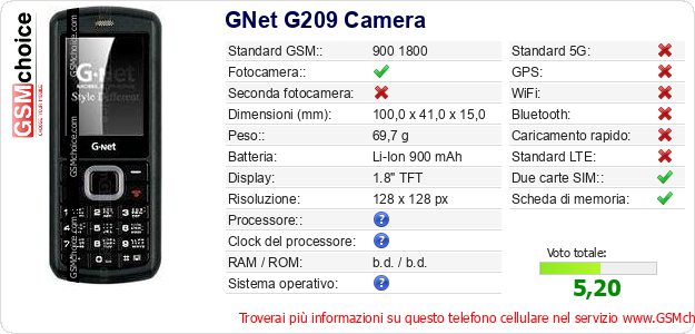 Dati del telefono cellulare GNet G209 Camera sul tuo sito