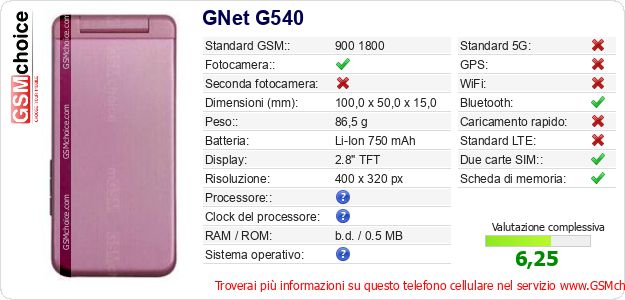 Dati del telefono cellulare GNet G540 sul tuo sito