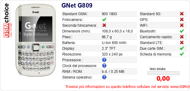 Dati del telefono cellulare GNet G809 sul tuo sito