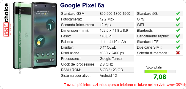 Dati del telefono cellulare Google Pixel 6a sul tuo sito