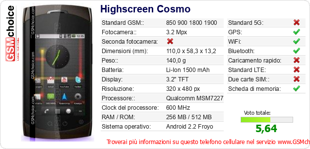 Dati del telefono cellulare Highscreen Cosmo sul tuo sito