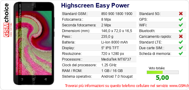 Dati del telefono cellulare Highscreen Easy Power sul tuo sito