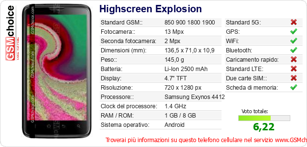 Dati del telefono cellulare Highscreen Explosion sul tuo sito
