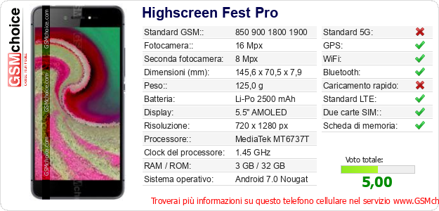 Dati del telefono cellulare Highscreen Fest Pro sul tuo sito