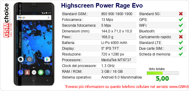 Dati del telefono cellulare Highscreen Power Rage Evo sul tuo sito