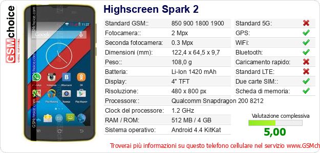 Dati del telefono cellulare Highscreen Spark 2 sul tuo sito