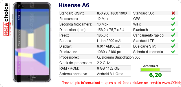 Dati del telefono cellulare Hisense A6 sul tuo sito