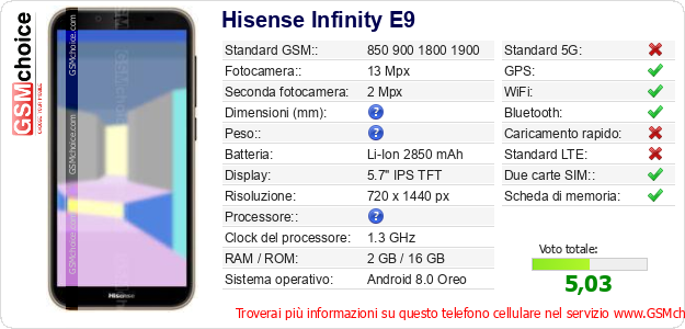 Dati del telefono cellulare Hisense Infinity E9 sul tuo sito