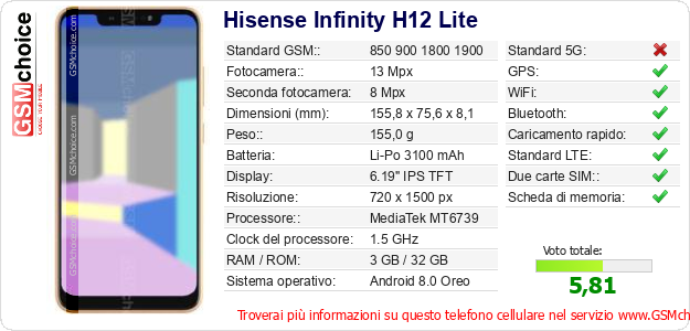 Dati del telefono cellulare Hisense Infinity H12 Lite sul tuo sito
